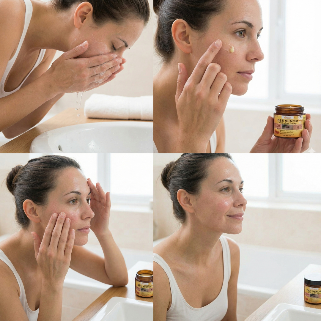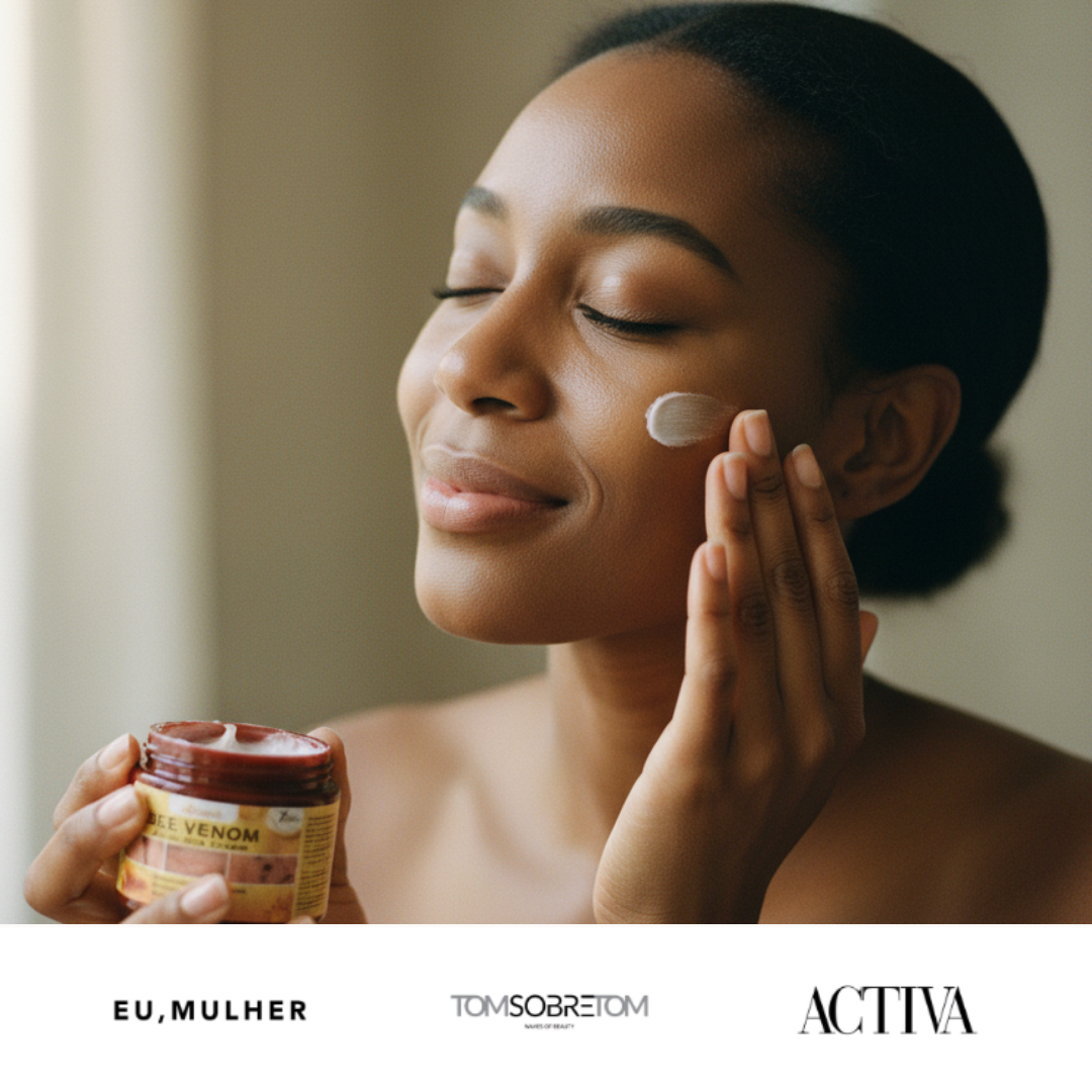 Comece sempre com a pele perfeitamente limpa e seca para garantir a absorção máxima dos ativos do veneno de abelha.